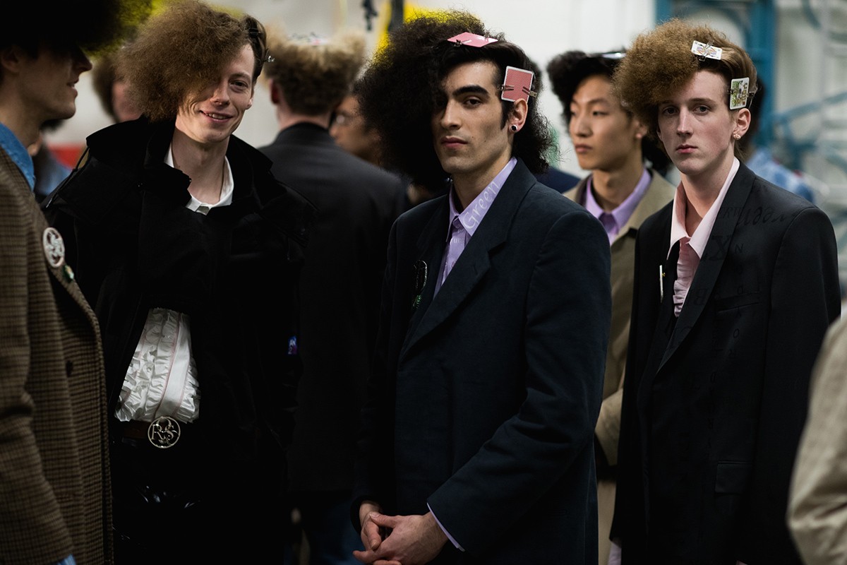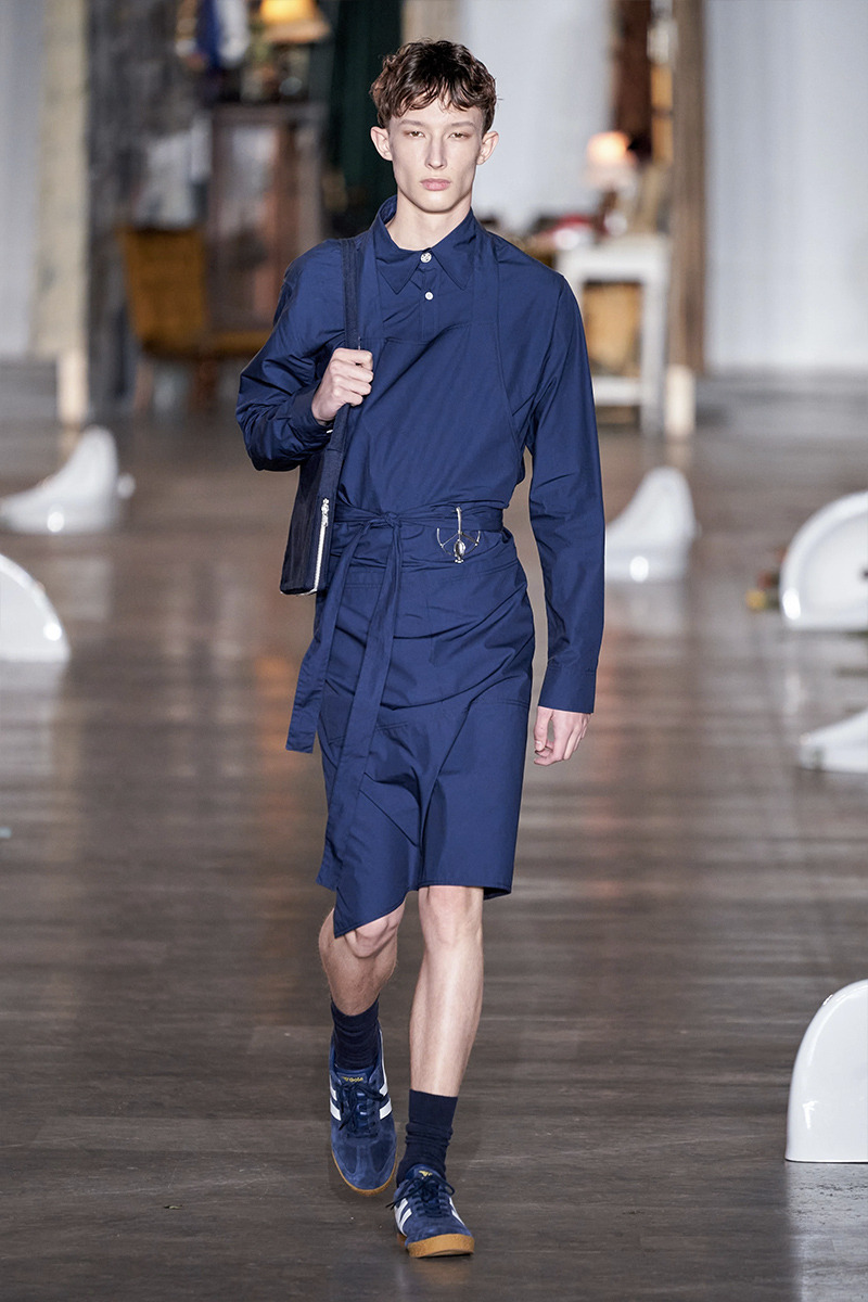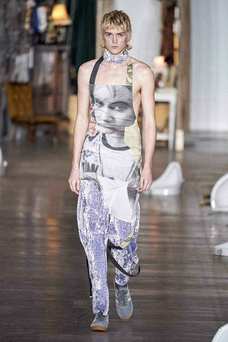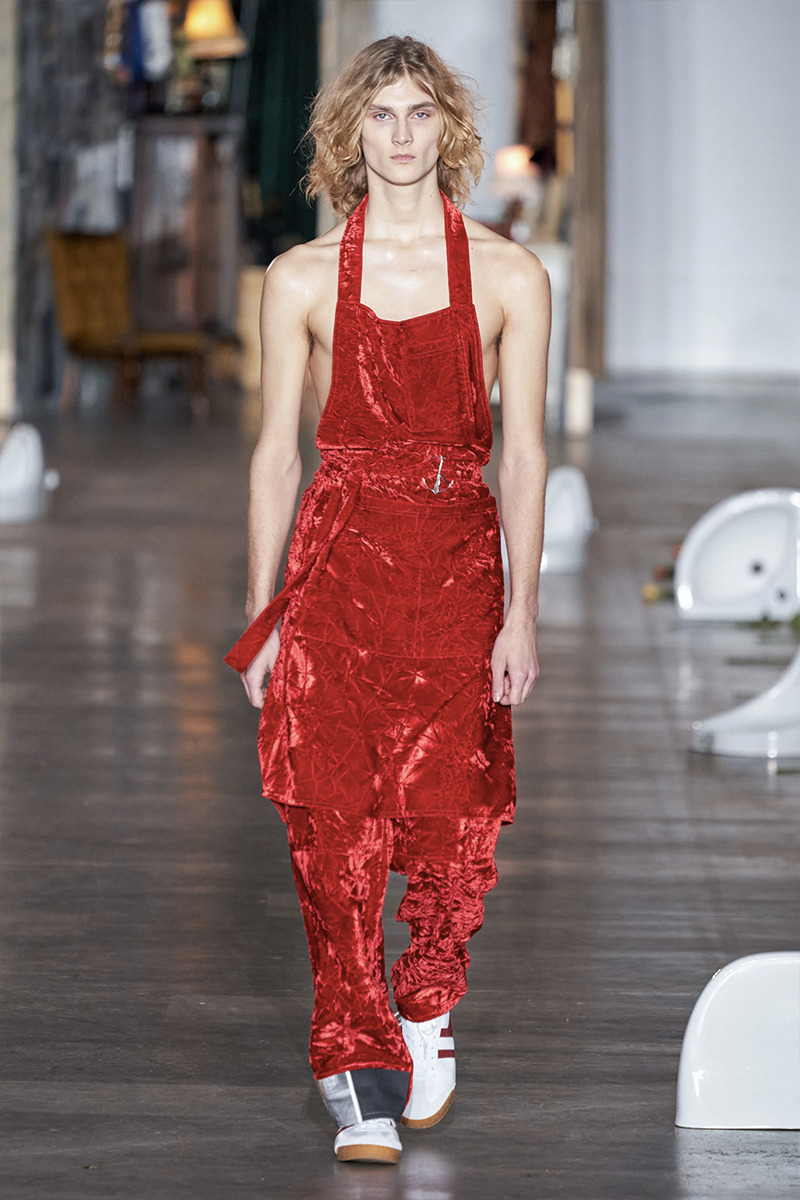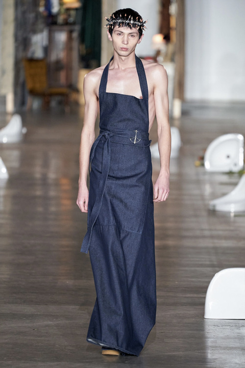 Vestidos masculinos, sí, esa es la propuesta de esta marca para el otoño/invierno masculino, aunque también encontramos mucha mezclilla y prints llamativos, pero sin duda los accesorios de esta colección son lo mejor de todo, coronas hechas de lapices que emulan la corona de espinas usada por Jesús de acuerdo a la tradición cristiana.