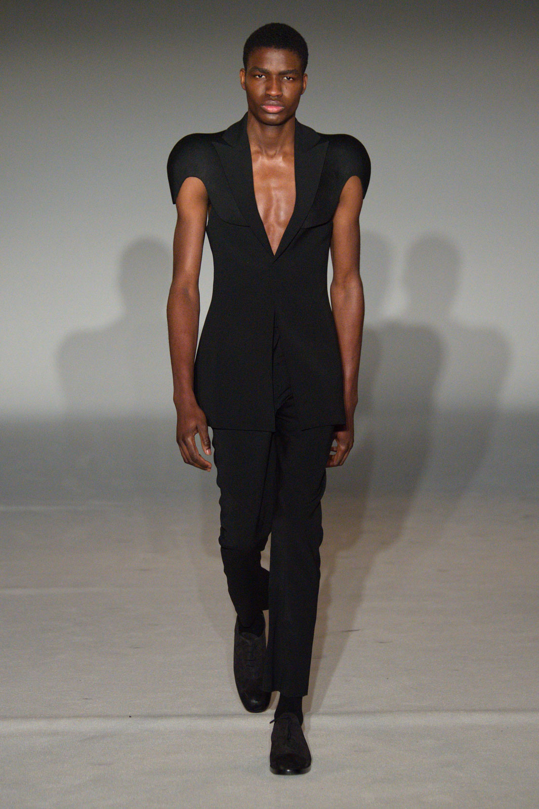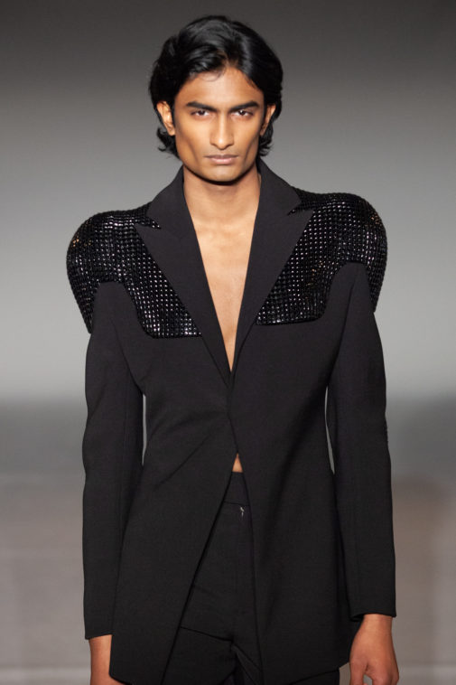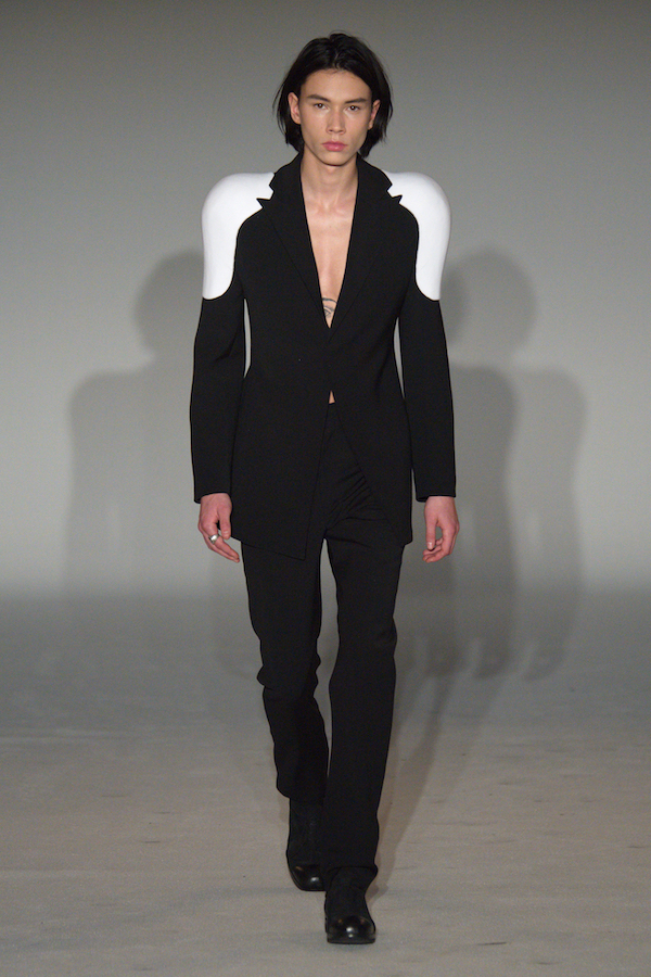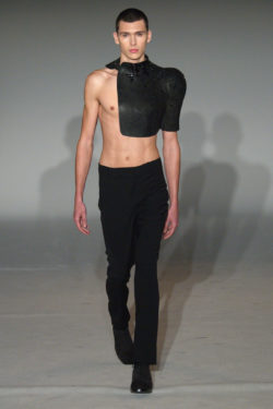 La propuesta de esta marca es bastante interesante, presenta hombreras y pectorales esculpidos, muy parecido a la propuesta de Tom Ford para primavera, pero con una visión más masculina.