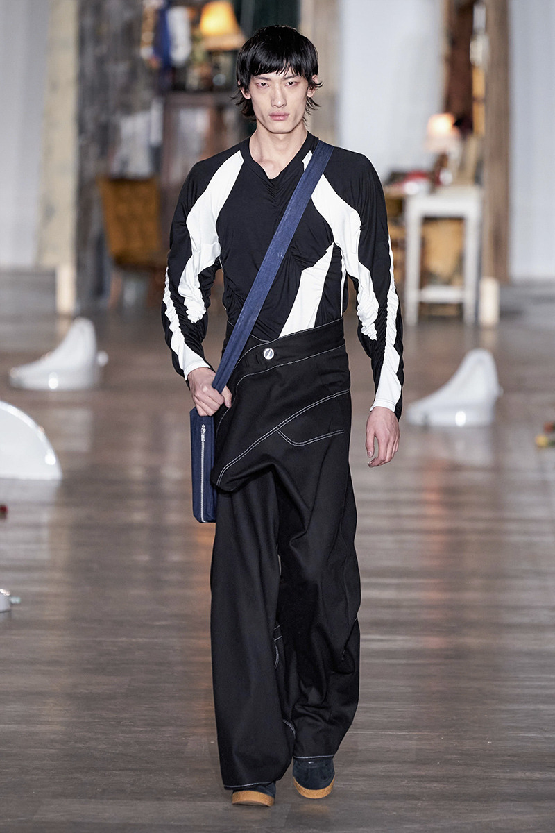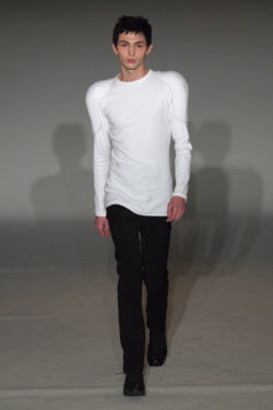 Imaginemos la esencia de Matrix, pero con menos leather, así es la propuesta que nos presenta John Lawrence, siluetas con un aire futurista, pero sin dejar de pisar el presente, con una fuerte influencia por lo andrógino. Nuestra prenda favorita son los pantalones de bota ancha.