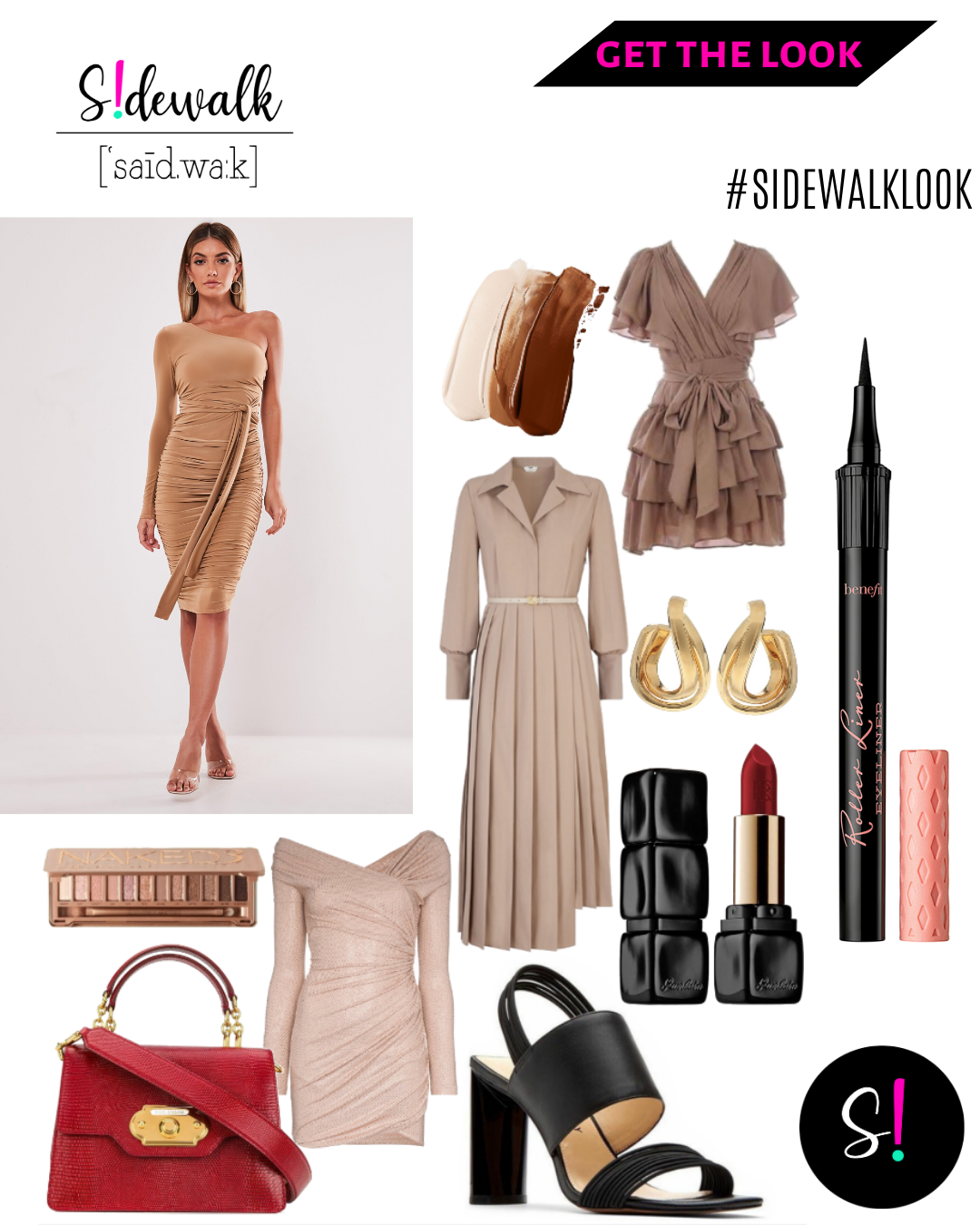 El look: un vestido de cóctel o midi, donde la premisa más importante sea un color nude que muy parecido al tono de tu piel, así lograrás la ilusión de que no llevas nada puesto, con este look el protagonista debe ser tu rostro, por lo que debes buscar dar un efecto dramático a tus ojos con un smokey eyes, un delineado de gato y un labial muy rojo; accesorios en dorado, tacones negros y un bolso rojo para dar un poco de color.