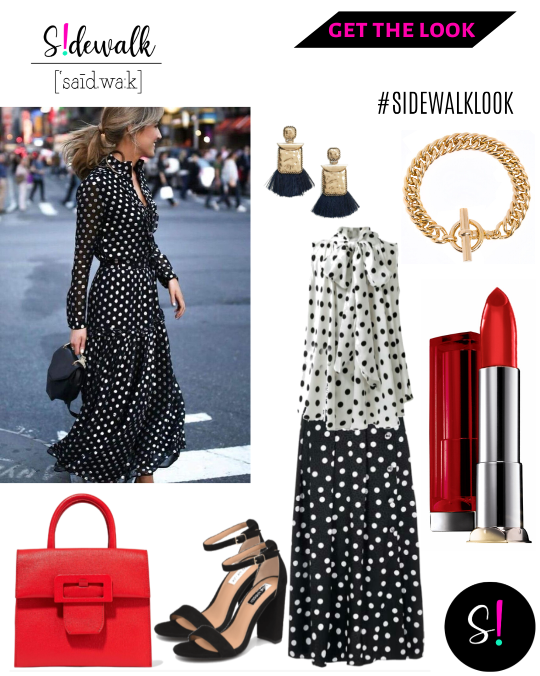 El look: prueba con una falda y blusa estampadas de lunares en blanco y negro, zapatos negros, un bolso en rojo, accesorios en dorado y un maquillaje que ponga como centro de atención los labios usando unos red lips de impacto.