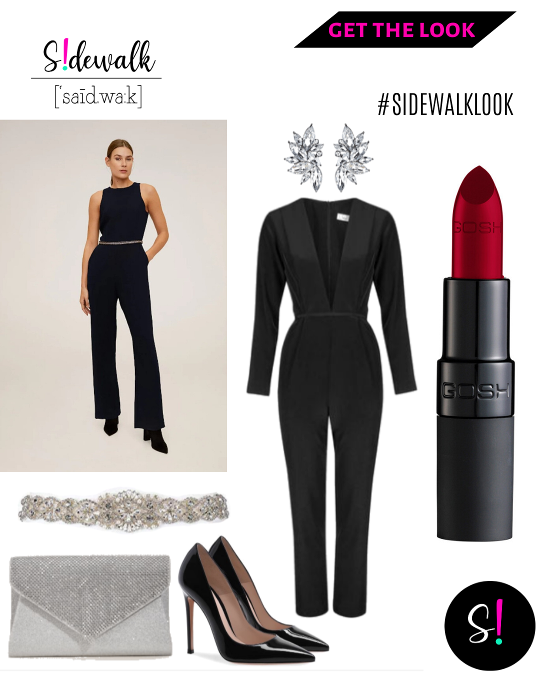 El look: un jumpsuit totalmente negro con o sin escote, accesorios de cristales en color plata y un cinto que haga resaltar tu cintura (si es de cristales o color plata mucho mejor), tacones tipo stilettos, una cartera tipo sobre en color plata y un maquillaje que otorgue el protagonismo a tus labios usando un lipstick en un color rojo brillante (opta por uno matte para no tener que estar retocándolo toda la noche).