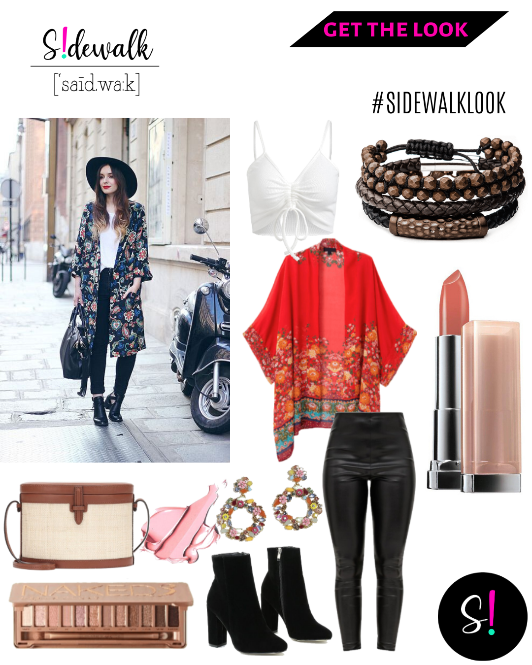 El look: nuestra apuesta se basa en un kimono que tenga flores, combinarlo con un top blanco o negro, unos leggins o vaqueros que contrasten con el top, botines con tacón, un bolso estilo bandolera, accesorios bohemios y un maquillaje sutil.